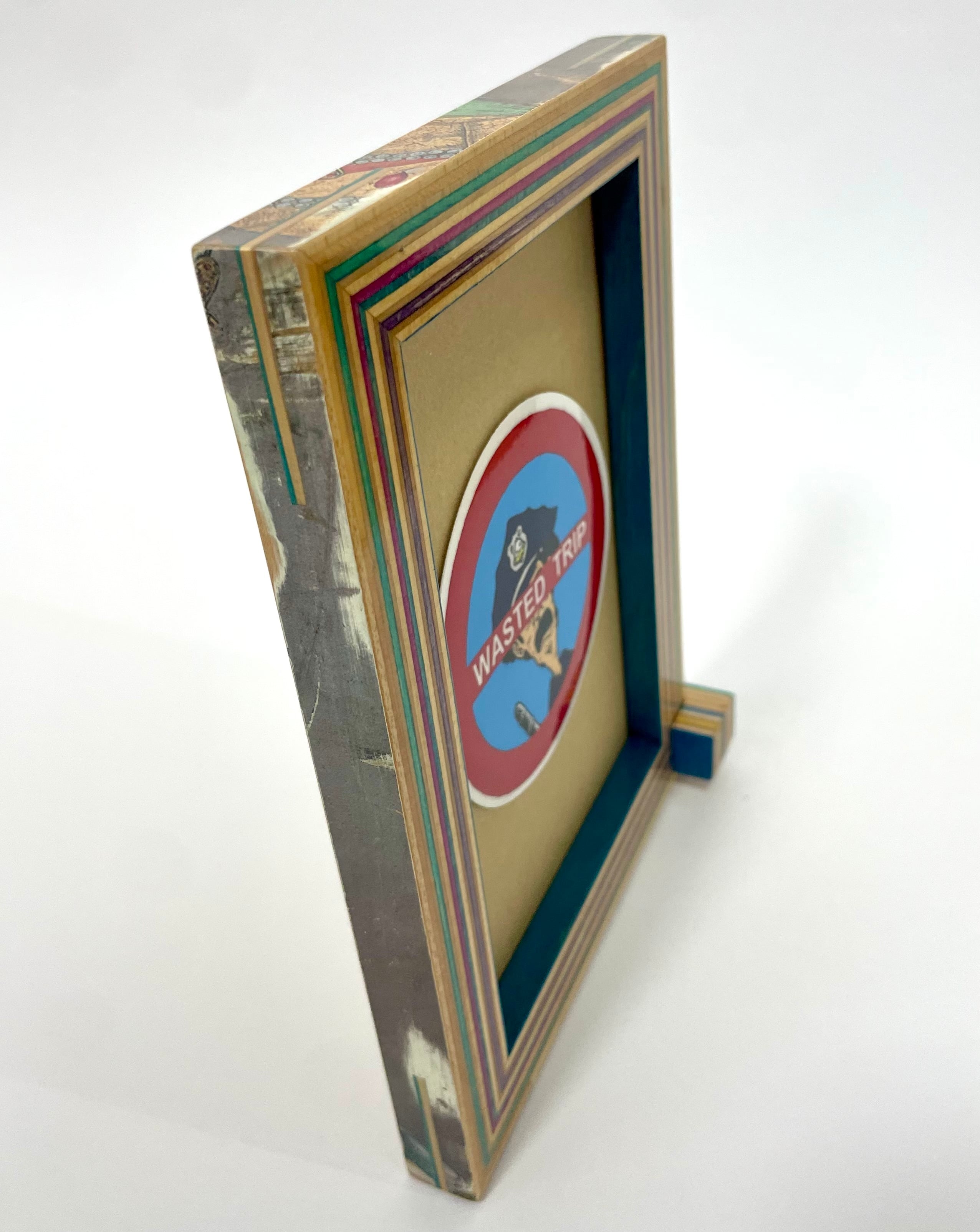 スケートボードの廃材をリサイクルしたポストカードサイズのフレーム。縦置き、横置き対応。