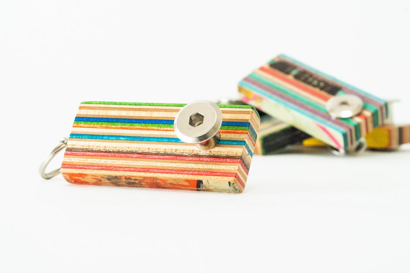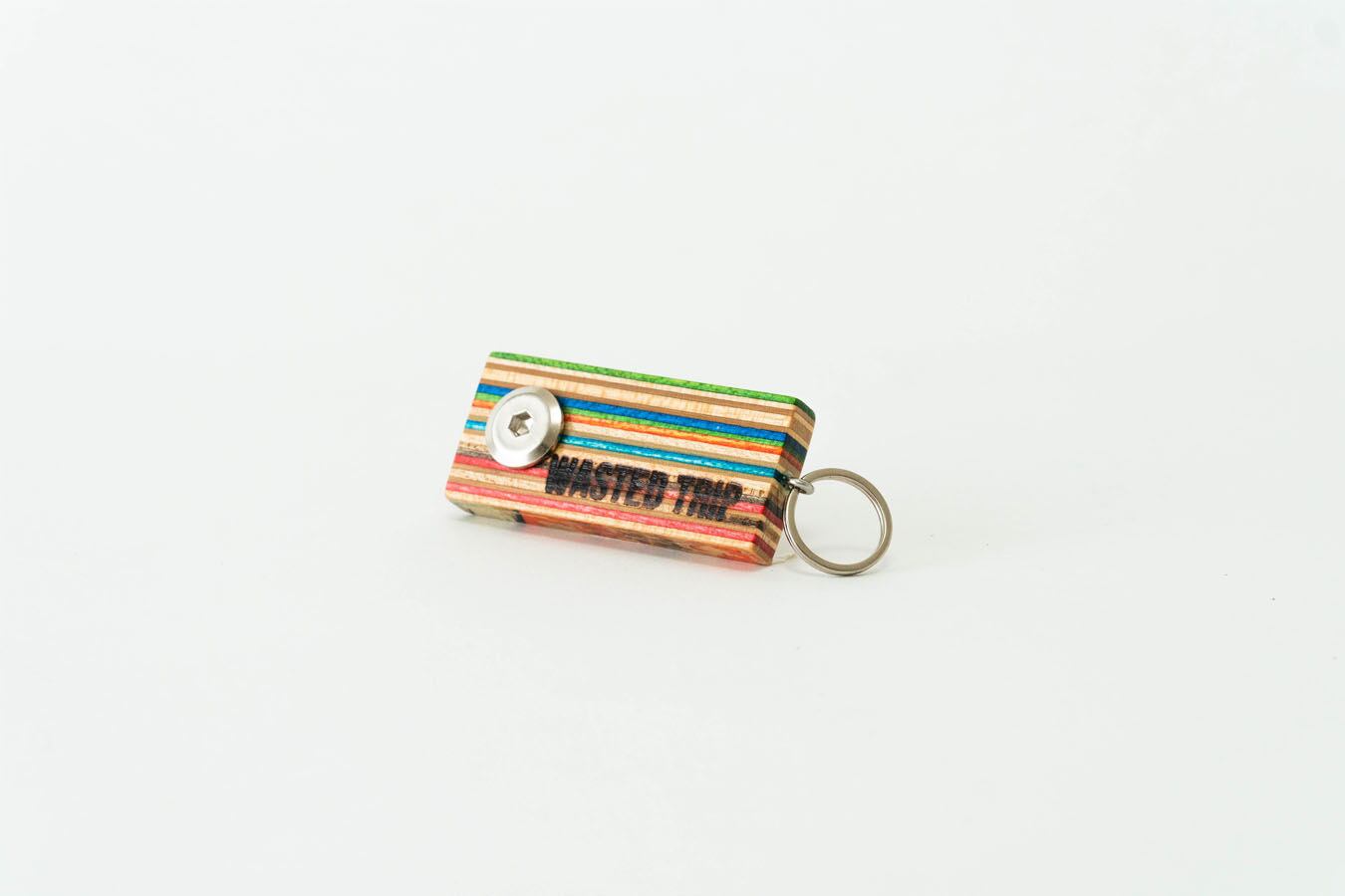 スケートボードをリサイクルしたキーホルダータイプのボトルオープナー。クラフトビールボトルなどの王冠を開ける時に、通常の栓抜きとは逆方向に開栓するため、王冠が凹む事なく開けられる仕様になっています。